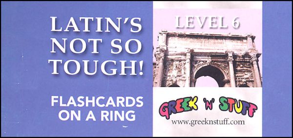 A promotional poster for a series of flashcards titled 'Latin's Not So Tough!' with the tagline 'Flashcards on a Ring'. The poster features a large, ornate archway in the center, surrounded by a blue background with a gradient from light to dark blue. The title and tagline are prominently displayed at the top and bottom of the poster, respectively. The website address 'www.greekstuff.com' is visible at the bottom right corner. | Latin's Not So Tough Flashcards on a Ring Level 6 | 8f15f7ff58bada1a25c6b8195902ce2b874af42d0ca244484f431090b8988f7a | 001065760682 | 0 | 0 | 70 | 10 | 0 | 0 | |