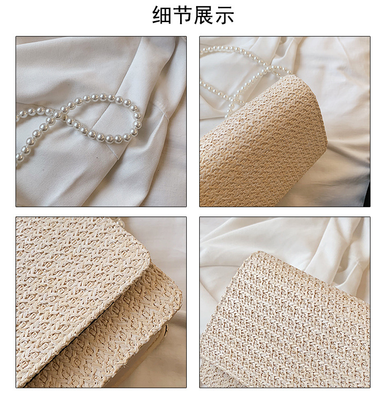 A close-up image of a beige handbag with a pearl necklace draped over it. The handbag is placed on a white surface with a white sheet underneath. The image is divided into four sections, each showing a different angle of the handbag and the pearl necklace. The top left section shows the handbag with the pearl necklace hanging down, the top right section shows the handbag with the pearl necklace draped over it, the bottom left section shows the handbag with the pearl necklace hanging down, and the bottom right section shows the handbag with the pearl necklace draped over it. There are Chinese characters in the top left corner of the | fashion straw woven pearl portable messenger small square bagpicture2 | 55cd492399b2794842c9d7366c08790e0e06c7fffc7783ffd7818db74de5656e | 001065760310 | 0 | 0 | 112 | 9 | 0 | 0 | |
