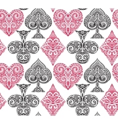 A pattern of playing cards with a pink and white color scheme. The cards are arranged in a repeating pattern with various card suits and ranks visible. The design includes hearts, diamonds, clubs, and spades, with some cards showing numbers and others with suits. The cards are overlaid with a decorative border featuring hearts and swirls. | Seamless pattern with playing card suits vector image | 142e5e5c437a3fbdf77fc7305a0bfebfc05556fa652a0dac85c4e5ada439a169 | 001065760731 | 0 | 0 | 56 | 8 | 0 | 0 | |