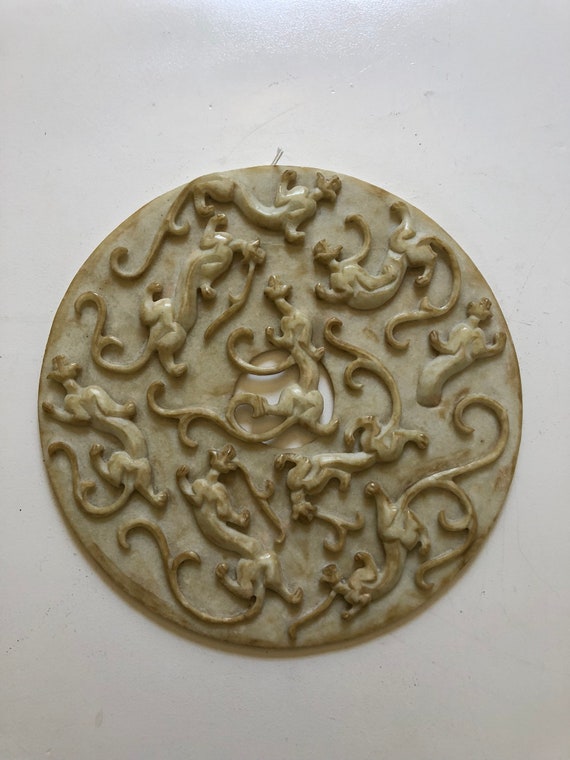 A close-up image of a circular, ornate object with a textured surface. The object features intricate designs with a variety of shapes, including swirls, curls, and figures that resemble animals or mythical creatures. The background is a plain, light color, and the object is centered in the frame. | Large Chinese Carved Marble White Tiger Bi Disc | 2636ff93385c9d261a1ffcf2b74173399a26c92e4f1b05ff9df69e22166e0b1d | 001065760459 | 0 | 0 | 48 | 8 | 0 | 0 | |