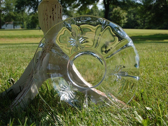 A clear glass plate with a floral design is placed on a wooden surface, which is on a grassy field. The plate is positioned at an angle, with its center slightly raised, and the wooden surface is partially covered by the grass. The background features a blurred view of trees and a house, suggesting a rural or suburban setting. | Vintage Clear Glass Ruffled Serving Bowl | 0931cb65053b28e667d775176d15d062f1eca8b3aa52e0da5c370469333fe1a4 | 001065760661 | 0 | 0 | 59 | 6 | 0 | 0 | |