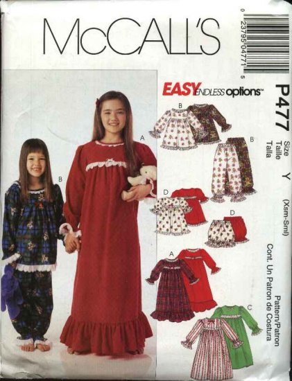 A pattern envelope for a sewing project featuring a woman and a child in red dresses. The envelope has a label that reads 'McCall's' and 'Easy Options' with a barcode and the number 'P471'. The pattern pieces are labeled with letters and numbers, and there are illustrations of the finished garments. | McCall's Sewing Pattern 477 4252 Girls Size 7-16 Easy Nightgown Pajamas Pants Shorts Bloomers Top | bdef00cb32f9a84ebe4712b6cdd9da123d30d72b99d625a93602a66fa2153f94 | 001065760658 | 0 | 0 | 51 | 15 | 0 | 0 | |