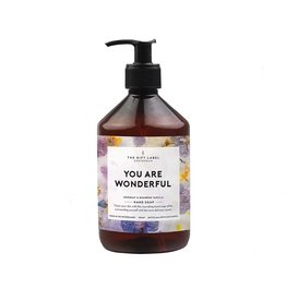 A bottle of hand soap with a label that reads 'You Are Wonderful' and a floral design. The bottle is filled with a clear liquid and has a black pump dispenser on top. The background is a plain white color. | The Gift Label Hand soap 500 ml. - You are wonderful - flowers | 947f9783c768468c69e20570adb7a2665342acb1036222dcdca8f15d33eb8a12 | 001065761151 | 0 | 0 | 40 | 13 | 0 | 0 | |