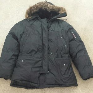 A black winter jacket with a fur-lined hood is laid out on a carpeted floor. The jacket has multiple zippers, buttons, and pockets, and appears to be a heavy-duty winter coat. | Winter down jacket polo Ralph Lauren black L women | b00c8d8397cbd9e5ae06e4b263db4987bddf278562c55dac87c6320aedae7e0f | 001065761263 | 0 | 0 | 31 | 9 | 0 | 0 | |