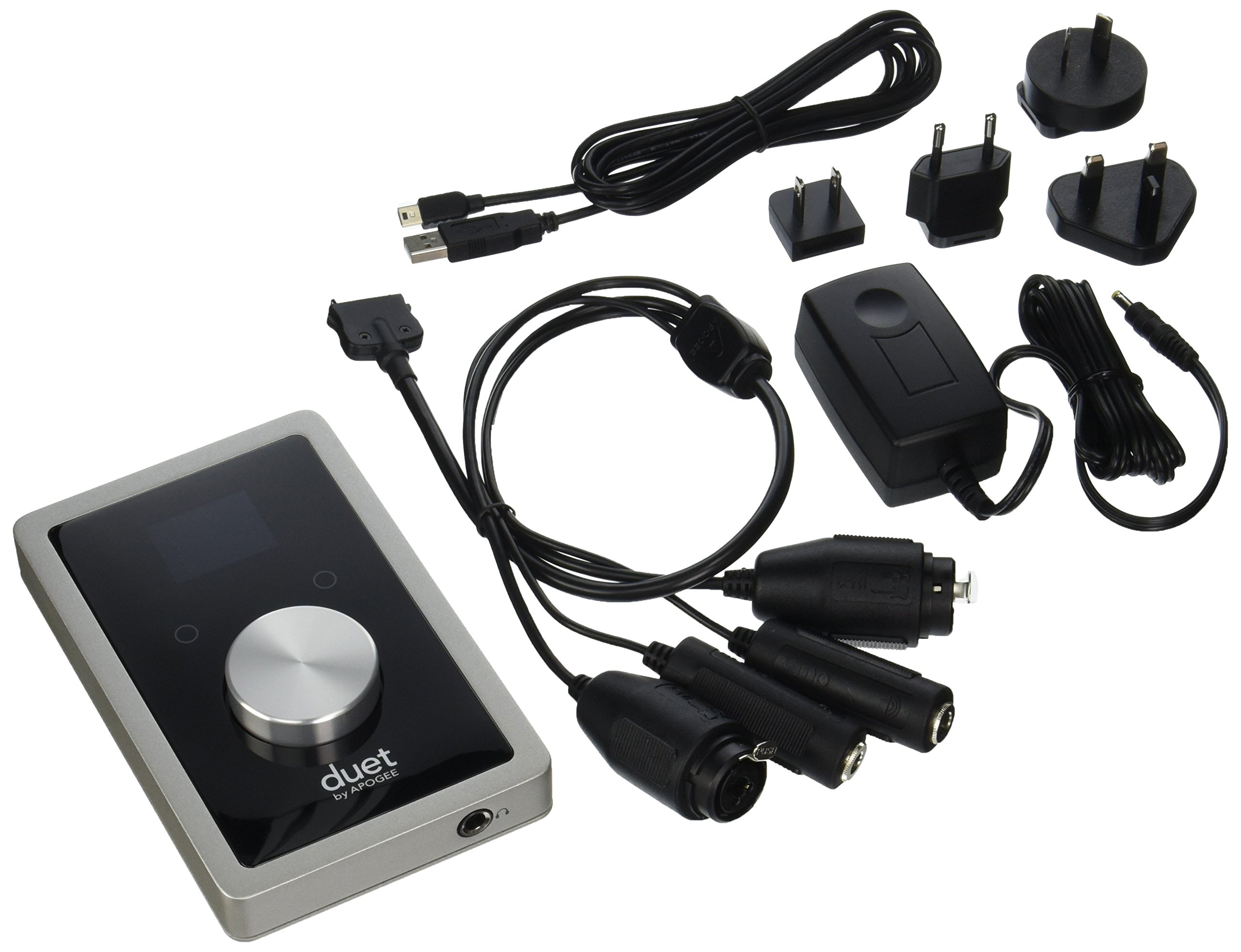 A collection of electronic devices and cables is neatly arranged on a white background. The items include a power adapter, a charging cable, a power bank, and various charging cables and adapters. The power adapter is black with a silver casing and has a digital display on the front. The charging cable is black with a silver connector and is coiled on top of the power adapter. The power bank is black with a silver casing and has a digital display on the front. There are multiple charging cables and adapters of different sizes and colors, including black, white, and gray. | Apogee Duet USB Audio Interface | 99a28947363f829e590691ea0cfdd47473ecb3a26ccd37e64c8d58e9be961b40 | 001065761164 | 0 | 0 | 101 | 5 | 0 | 0 | |
