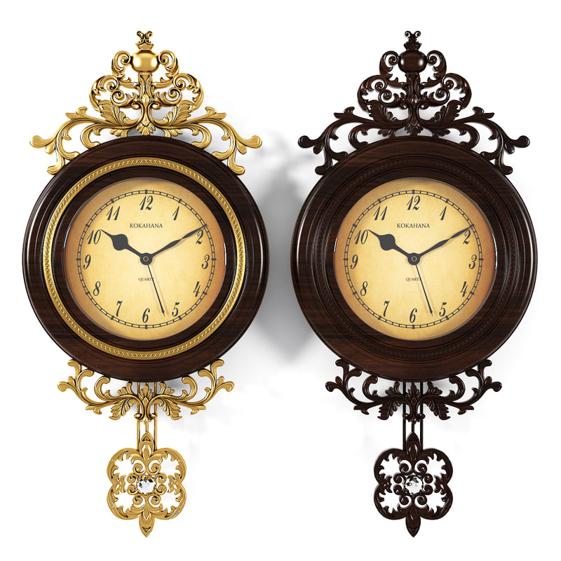 Two vintage clocks with ornate wooden frames and gold accents are displayed against a white background. The clock on the left has a golden frame with intricate floral patterns and a gold-colored face with black Roman numerals. The clock on the right has a dark wooden frame with a similar floral pattern and a yellow face with black Roman numerals. Both clocks have black hands and are set to approximately 10:10. | 3d model wall clocks | 0b425e80ffa6030eb9b78fb163f6f0718d709ce7dfc6ea55f3ca87600bd1c569 | 001065761128 | 0 | 0 | 71 | 4 | 0 | 0 | |