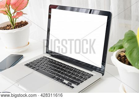 A silver laptop is open on a white desk with a blank screen. Next to the laptop, there is a smartphone and a potted plant with pink flowers. | Modern Workspace, Mock Up Laptop Computer Blank White Screen, Eyeglasses And Smartphone White Table | f30b84e75532e428907f8f0f2e090ce253ad854b44138cfa0f7d5ce5b91d9751 | 001065761165 | 0 | 0 | 28 | 14 | 0 | 0 | |