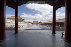 A traditional Chinese temple with red pillars and a golden roof is visible through an archway. The sky is partly cloudy, and the temple is surrounded by a large open area with white benches and a few people in the distance. | Beijing Forbidden City. Forbidden City in Beijing, 2009 Stock Images | 607573b13ee5fadb830e77fe36f263affe3a8394a633e18dbbb74c24efb2c58c | 001065761194 | 0 | 0 | 41 | 10 | 0 | 0 | |