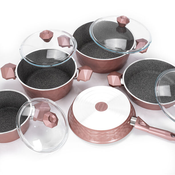 A collection of transparent glass cookware with a metallic finish, including pots, pans, and a lid, is arranged on a white background. The cookware has a modern design with a textured surface and a metallic handle. | Alberto 9 Pieces Diamond Cookware Set With Glass Lid Rose Color image number 3 | fb1544739dddebf8e18076e9efbe2ef4d8ac76ee6efaa7a6e2955dd03061eb76 | 001065761179 | 0 | 0 | 36 | 14 | 0 | 0 | |