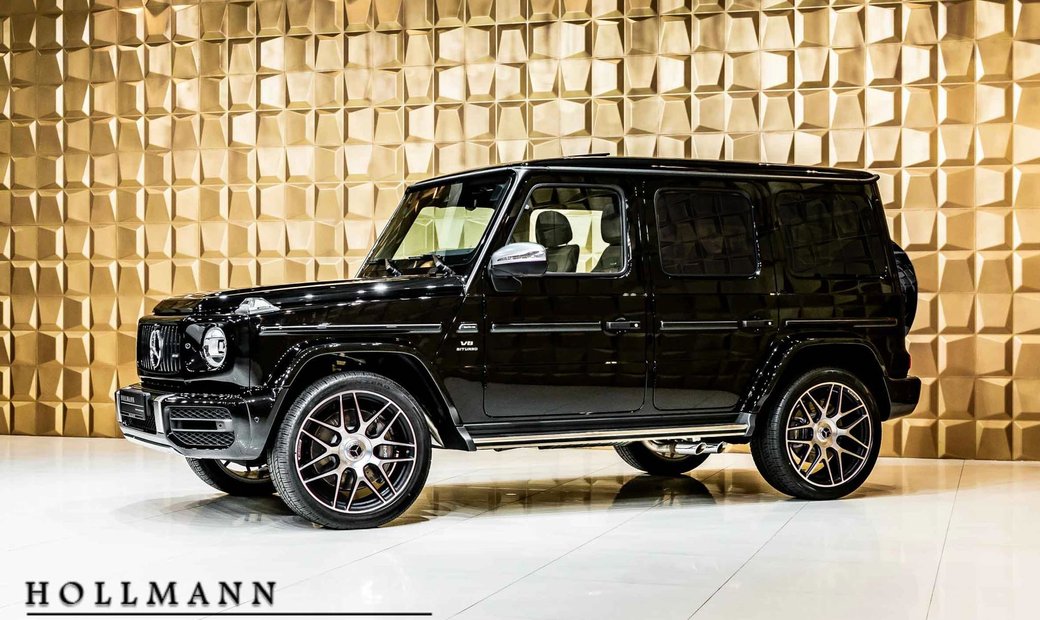 A black SUV with a sleek design and large wheels is displayed on a white floor against a golden wall with a geometric pattern. The SUV has a prominent grille, large windows, and a modern look. The word 'HOLLMANN' is written in white letters at the bottom of the image. | MERCEDES-BENZ G 63 AMG STRONGER THAN TIME | a62aca56014e997584967044783bc069a26b282665f35164f94ef03fd7df741d | 001065761276 | 0 | 0 | 50 | 7 | 0 | 0 | |
