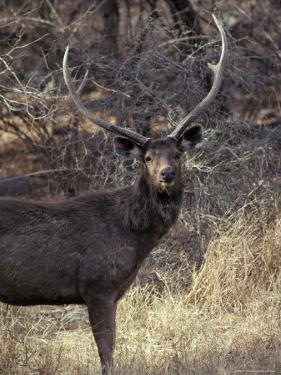 A majestic stag with large, curved antlers stands in a dry, grassy field surrounded by sparse trees and bushes. | Sambar Deer Stag with Impressive Antlers Stands to Attention by Jason Edwards | ea7127a51b7702bec463aad8d9d70b320388227ac374375a8c96549f6f693890 | 001065761345 | 0 | 0 | 19 | 12 | 0 | 0 | |