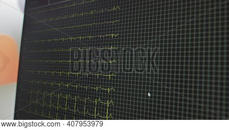 A close-up of a computer monitor displaying a heart rate monitor graph with the word 'BIOS' at the top. The graph shows a steady heart rate with peaks and troughs, and there is a copyright notice at the bottom right corner with the number '404-777-7999'. | Heart Rate Monitor In Hospital Theater. Medical Vital Signs Monitor Instrument In A Hospital On Anes | 49172ed9dadf8e32ab5f5c1e9fab25cdc9c436a45cbd3dab2dd0f4ba449d2149 | 001065761310 | 0 | 0 | 45 | 16 | 0 | 0 | |
