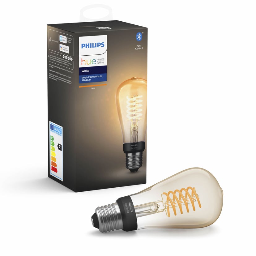A Philips Hue smart bulb is displayed in a black box with a white label featuring the brand name and product information. The bulb is shown in a clear plastic casing, with its light turned on, emitting a warm glow. The bulb has a black base and a silver top, and the light is shaped like a classic incandescent bulb with a coiled filament visible inside. The box also contains a white energy label with a green 'A' rating and a yellow 'B' rating. | Philips Hue White xW Filament ST64 E27 | 55f250886aa4b7ef92b3f25cb984b01cc47f75c1544406d2ade30703f5d7f49c | 001065762448 | 0 | 0 | 84 | 7 | 0 | 0 |