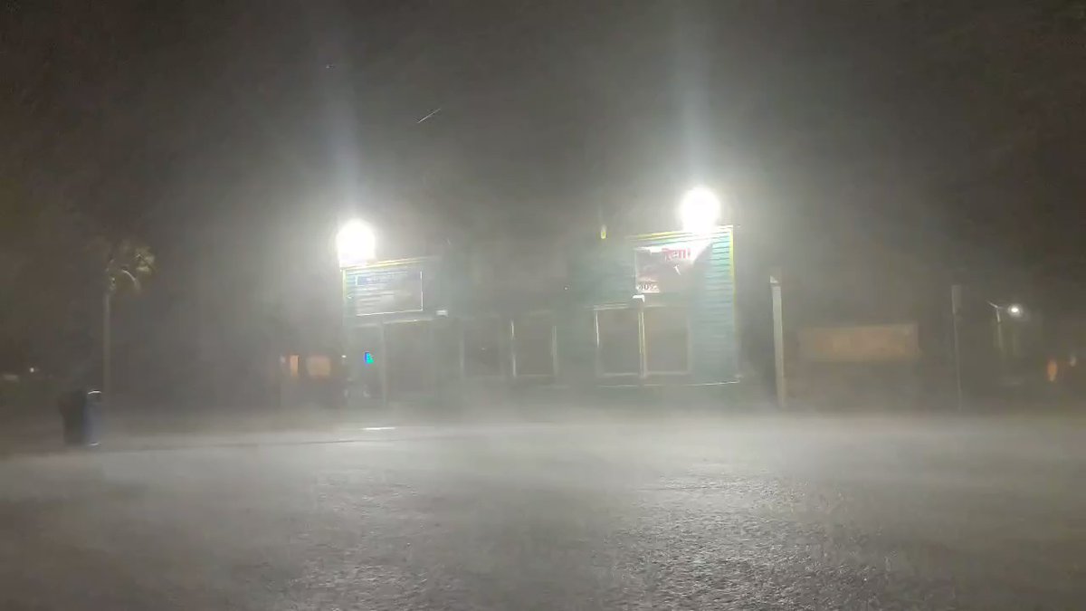 A rainy night scene with a wet street reflecting the lights from a street lamp and a building. The sky is overcast, and the rain is visibly falling. The building has a sign with a blue and green color scheme, and there is a trash can on the left side of the street. | 1:19 AM winds still ripping in Galveston. Many locations without power including the Doubletree hotel in this shot. Not sure what has the scooter place lit up. On Seawall Blvd, right on the Gulf. Little ankle biter of a storm. | 0475915c24a61f69eff90536ecef798e0f77413c66127921e6f03adb7e1dce33 | 001065762369 | 0 | 0 | 53 | 40 | 0 | 0 | |