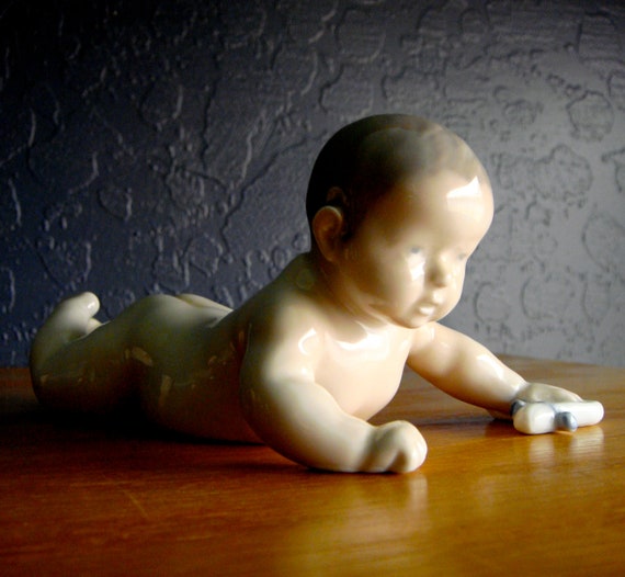 A white porcelain doll with a smooth, shiny surface is lying on a wooden table. The doll has a neutral expression with closed eyes and a slight smile. It is positioned with its head turned to the side, and its body is relaxed, with one arm slightly raised and the other extended towards the edge of the table. The doll's hair is styled in short, wavy strands. | Vintage Royal Copenhagen Naked Baby With Sock 1739 Piano Baby | 35c118c8b5a49153c6a69bcbded25da11b5f9be984f63f105c781eba2bb99d0c | 001065762387 | 0 | 0 | 67 | 10 | 0 | 0 | |