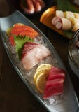 A variety of sushi pieces are neatly arranged on a blue rectangular plate. The plate contains a selection of nigiri, including salmon, tuna, and other types of fish, as well as a slice of lemon. The sushi is garnished with a green leaf and is served on a bed of ice. The plate is placed on a wooden surface, and there is a small bowl with soy sauce to the right of the plate. | Sashimi Stock Foto's | 16597bee9d7bdc680025867a88b7cd07f8e8d728ac3cee6cf47786830e97d88f | 001065762468 | 0 | 0 | 74 | 3 | 0 | 0 | |