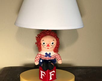 A small, red-haired doll with freckles and a blue bow is sitting on a yellow base with the letter 'F' on it. The doll is positioned under a white lampshade, which casts a shadow on the wall behind it. | Vintage Raggedy Ann Raggedy Andy Lamp, Vintage Bedroom Nursery Lamp, Nursery Table Lamp,Raggedy Ann Child's Bedroom Lamp, Boy's Nursery Lamp | 4cd6e6e1bee6e81603e6f091bc6c8cc7a6f511fc6cf257755931e272dafbe049 | 001065763414 | 0 | 0 | 39 | 20 | 0 | 0 | |