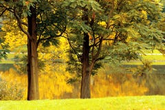 A serene park scene with a large tree on the left, its leaves in shades of yellow and green, reflecting on the calm surface of a lake. The tree's reflection is visible in the water, creating a symmetrical image. The background is softly blurred, with hints of greenery and a clear sky. | Autumn landscape Royalty Free Stock Photos | 1fbb77b4177eb3c289b0e6f75964d82dffe48d147fc1f7a2aadab65f44ebd1cb | 001065763381 | 0 | 0 | 52 | 6 | 0 | 0 | |
