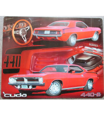 The first image shows a red classic muscle car with the license plate '414-8' on a glossy surface. The car is depicted in a stylized manner with a focus on the front and side views. The background is a gradient of red and black, and there is a large steering wheel in the upper left corner, which is also stylized. The image has a reflective quality, and the word 'CUDA' is visible at the bottom. | plaque cuda 440-6 orange de... | f0677149d422964716bcb661dc3ce07b4e91aa42c340a1f35b045e72e12c6d64 | 001065763317 | 0 | 0 | 75 | 5 | 0 | 0 | |