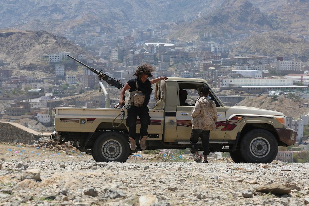 A rugged pickup truck is parked on a rocky hillside with two people standing beside it. The person on the left is wearing a black vest and holding a rifle, while the person on the right is wearing a camouflage jacket and also holding a rifle. The truck has a large gun mounted on its roof. In the background, there is a cityscape with buildings and a clear sky. | Government forces attack positions of Houthis and pro-Saleh militants during an operation in Taiz province, Yemen on 6 April 2017 [Abdulnasser Alseddik/Anadolu Agency] | fb66b2b719c2308ef2dfa83bbe6a1cb8eda32ec521845c620ee6182113b10ece | 001065763245 | 0 | 0 | 69 | 23 | 0 | 0 | |