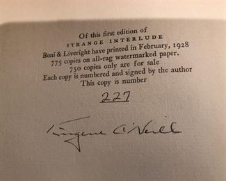 A close-up view of the top right corner of a book page, featuring the title 'Of This First Edition of STRANGE INTERLUDE' and the author's name 'BonI & Liveright'. The page also includes a copyright notice and a statement about the number of copies printed. The text is in a serif font, and the page has a vintage appearance with a textured background. | Eugene O'Neill signed copy of Strange Interlude | 52a8fc1fb7134aeb8413254446a0533320565dfb5cdcf68e6e6599c9e80dac63 | 001065763441 | 0 | 0 | 63 | 7 | 0 | 0 | |