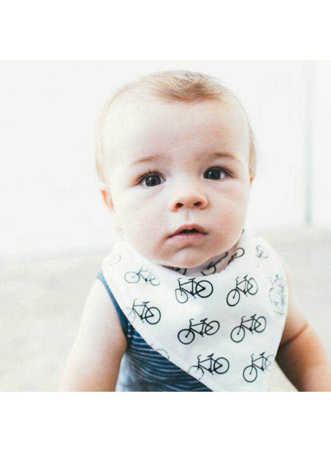 A baby with a white bib featuring a black bicycle design is standing. | Cruise Baby Bandana Bib Set (4-pack) | 674cbc0d84a9e813b970a3a2a10ea2f782ad4bf65ef93900f20659e8295f1974 | 001065763577 | 0 | 0 | 13 | 6 | 0 | 0 | |