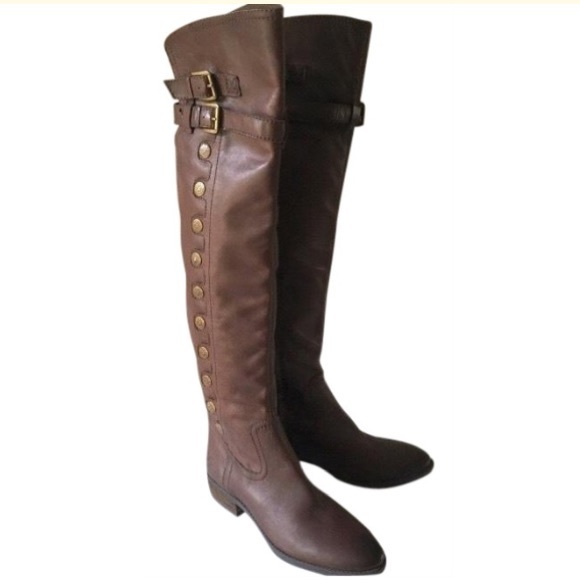 A pair of brown leather boots with a buckle detail on the upper part and a zipper on the side. The boots have a pointed toe and a stacked heel. They are displayed against a white background. | Sam Edelman Shoes - Sam Edelman Pierce 2 Over The Knee Riding Boot | 8638b9bf6b42d7f31ff4fbeb8ee3def99450faa08b3010df961f9487ededb240 | 001065763675 | 0 | 0 | 37 | 13 | 0 | 0 |