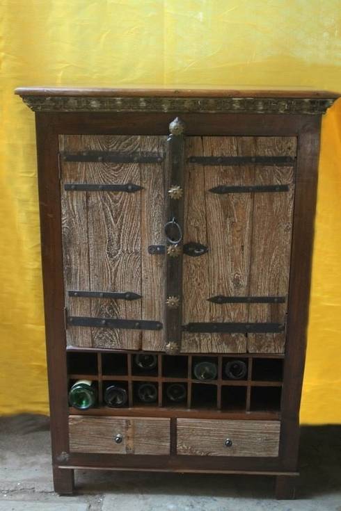 A rustic wooden cabinet with a weathered finish and visible grain patterns. The cabinet has a simple design with a single door that is slightly ajar, revealing a small compartment with several empty glass bottles inside. The cabinet is placed on a wooden floor, and the background is a yellow curtain. | Cupboards and cabinets: rustic Bedroom by Uttara And Adwait Furniture | da7ba137f1691b4b39c7aa8bab272e713936ccc4f172353bad09935dace8c4ba | 001065763585 | 0 | 0 | 51 | 10 | 0 | 0 | |