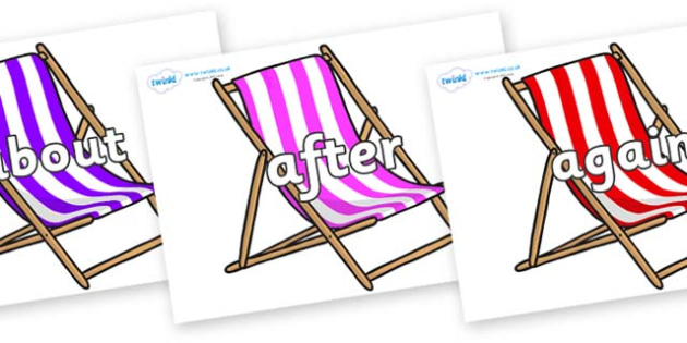 The first image shows a white beach chair with a red and white striped pattern. The word 'about' is written in large, bold, white letters across the chair. The chair is set against a plain white background with a small blue logo in the top left corner. | KS1 Keywords on Deck Chairs - KS1, CLL, Communication language and literacy, Display, Key words, high frequency words, foundation stage literacy, DfES Letters and Sounds, Letters and Sounds, spelling | 66785b338411df282f66d000d2927a38d960ea9a2e9ee8a0f4dedf1fb17c26ad | 001065763605 | 0 | 0 | 47 | 29 | 0 | 0 | |