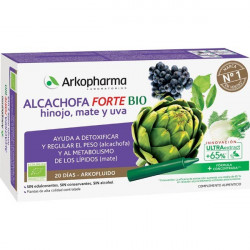 A box of Arkopharma Alcachofa Forte Bio capsules is displayed. The box features a green and purple color scheme with a prominent image of a green artichoke on the front. The text on the box includes 'Alcachofa Forte Bio', 'Hinojo, Mate y Uva', 'Ayuda a Detoxicar el Higado y Regular al Metabolismo', 'De los L\xc3\xadpidos', 'Mate', and '20 dias'. There is also a green and white label with the text 'N1' and '65%'. | ARKOFLUIDO ALCACHOFA FORTE 20 AMPOLLAS 15 ML | 0ff199a17483832e95cf22ab469c3f9fe6fe7c6ae765174e22767ec9a9ba54a4 | 001065763497 | 0 | 0 | 73 | 7 | 0 | 0 | |