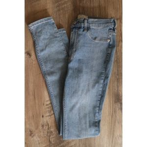 A pair of blue jeans is laid out on a wooden surface. The jeans are positioned with the left leg in front and the right leg behind it. The front leg is folded at the knee, while the back leg is straight. The jeans have a button fly and a belt loop at the top. The fabric appears to be denim, and the jeans have a relaxed fit with a straight cut. | FP Light Wash Long & Lean Skinny Jeans | 9aa5799a6082d3d587bad6a0b1c0e25cdcfbe3f7ee1ae5e8d8a3b5f2fe491cf3 | 001065763913 | 0 | 0 | 72 | 8 | 0 | 0 | |