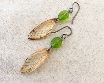 A pair of earrings with a green gemstone and a wing-shaped design. The earrings are attached to a silver earring hook and are placed on a white surface. | Niobium Earrings Cicada Wing Earrings Shamrock Real Bug Insect Lover Gift Nature Earrings Preserved Specimen Real Cicada Eco Resin Wing | ccadacb24d4e8c029ded7de3a5bca7235e0e72abd748e2eb7c836640ed15e50b | 001065763837 | 0 | 0 | 28 | 20 | 0 | 0 | |