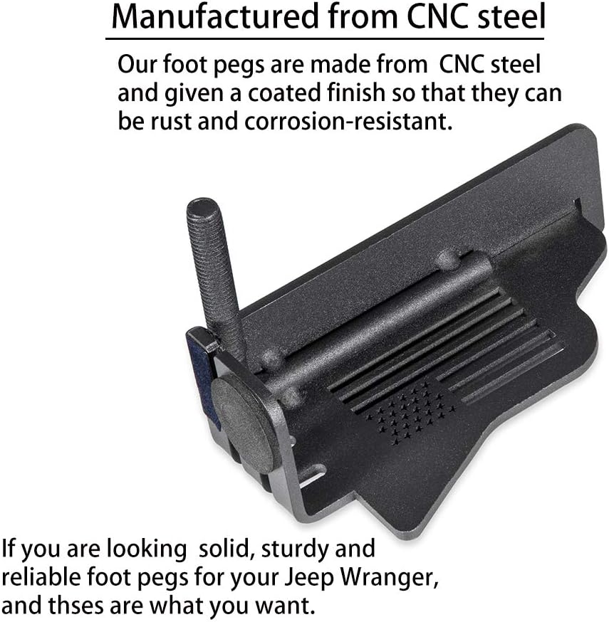 A black CNC machined steel foot peg is displayed against a white background. The peg has a smooth, polished surface and a single bolt on top. Below the peg, there is a text block with a manufacturer's statement and a warning message. The text reads: 'MANUFACTURED FROM CNC STEEL. OUR FOOT PEGS ARE MADE FROM CNC STEEL AND GIVE A COATED FINISH SO THAT THEY CAN BE RUST AND CORROSION-RESISTANT. IF YOU ARE LOOKING SOLID, STURDY AND RELIABLE FOOT PEGS FOR YOUR JEEP WRANGLER, AND THOSE | Bonbo Steel Front Foot Pegs Rest Pedal Exterior Door Hinge With US Flag for 2007-2020 Jeep Wrangler JK JKU JL JLU\xef\xbc\x882pcs\xef\xbc\x89 | 1212140c240e7853f2ea6b1f7f03ca3611125563fb157e288d55162f96aeaf55 | 001065764367 | 0 | 0 | 86 | 21 | 0 | 0 | |
