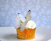A cupcake with a golden wrapper and white frosting is placed on a white plate. The cupcake is adorned with two white paper butterfly decorations, one on top of the other, with blue accents on their wings. The background features a patterned wallpaper with a blue and white floral design. | Edible Buttterflies for Cupcakes and Cakes - Small White Edible Butterfly - Cupcake and Cake Decoration | a2770333ba25b07fdd332ff5dd6884acddc09168102e8cf7ec6b5f76b9198b86 | 001065764369 | 0 | 0 | 50 | 16 | 0 | 0 | |