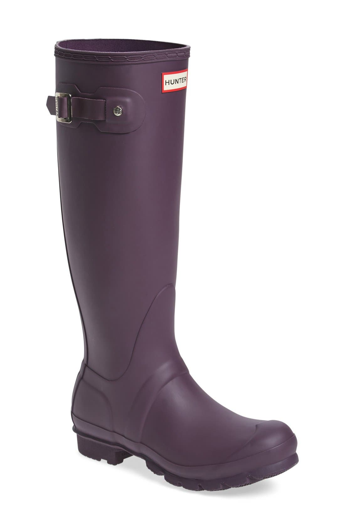 A pair of purple rubber boots with a shiny finish and a brown trim around the top. The boots have a smooth surface and are standing upright against a white background. | HUNTER,\n Original Tall Waterproof Rain Boot,\n Main thumbnail 5, color,\n 555 | 9678d646b25db08a81176126d89e2e5ca78f471c2edecb59917a932c4fc83b51 | 001065764406 | 0 | 0 | 31 | 11 | 0 | 0 | |