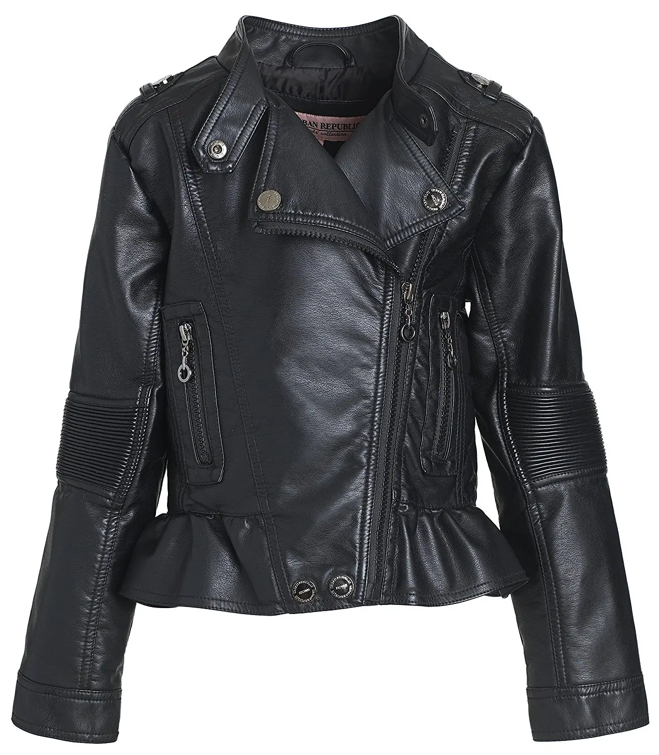 A black leather jacket with silver zippers and buttons is displayed against a white background. The jacket has a fitted silhouette with a high collar, long sleeves, and a front zipper closure. There are multiple zippers and buttons on the front, and the jacket appears to be made of a thick, high-quality leather. | 76d62398964f Cheap Young Girls Leather Jacket | e19d6f8a59215f2911b52bec1a8447cabfb6df1540762911aad9fb639b1c10c3 | 001065764414 | 0 | 0 | 53 | 6 | 0 | 0 | |