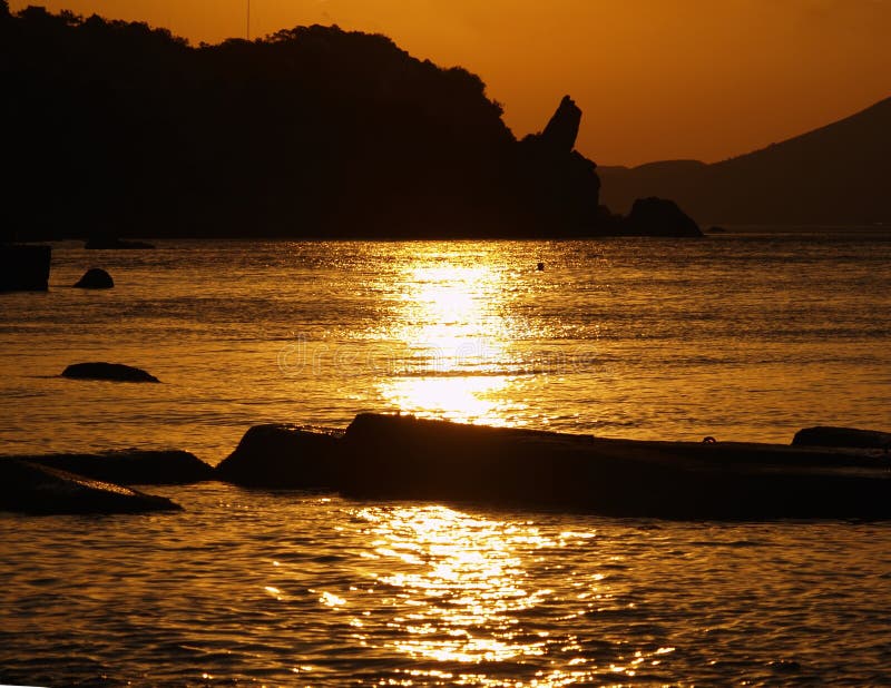 A serene sunset over a calm ocean with a warm golden glow reflecting off the water. The sun is low on the horizon, casting a soft light on the scene. The sky is clear with a gradient of warm colors, and the water is smooth with gentle ripples. There are no visible objects or people in the water, and the focus is on the natural beauty of the sunset. | sea, silhouette of mountains stock photos | a26ddde9887b38834d92ca078bc1778256ddae8dd053a51ee59ec323b25a6c5b | 001065764346 | 0 | 0 | 69 | 6 | 0 | 0 | |
