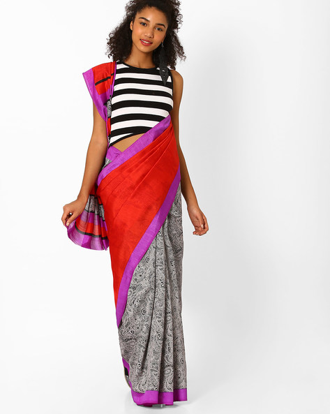 A young woman is wearing a black and white striped top with a red and purple sari draped over her shoulders and a matching red and purple sari with a grey patterned border around her waist. | Printed Bhagalpuri Silk Saree By Florence ( Red ) | dfe49bbe26e52978c467e8f8bb9b33c011625092db944e4180a14d56e4f7bd7e | 001065764335 | 0 | 0 | 36 | 9 | 0 | 0 | |