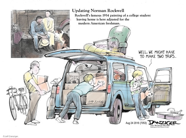 The second image is a comic strip version of the first image, with the same scene of a family packing a car for a trip. The characters are now illustrated with exaggerated features and are depicted in a humorous, cartoonish style. The text bubbles contain speech and thought balloons, adding a narrative element to the scene. The image is labeled 'UPDATING NORMAN ROCKWELL' and includes a caption that reads 'Painting a college student's home is a modern American tradition.' The image is signed 'DANZIGER' and dated 'AUGUST 15, 1997'. | Cartoonist Jeff Danziger Jeff Danziger's Editorial Cartoons 2016-08-25 sink | c5392d97204112e520d0b6b4e0d804bffa84ee8f852c139880b202e5b976eeef | 001065764417 | 0 | 0 | 89 | 9 | 0 | 0 | |