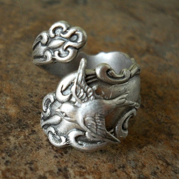 A silver ring with an intricate bird design is placed on a textured surface. | Bird Spoon Ring,The ORIGINAL Silver Spoon Ring with Swooping Sparrow,*** Exclusive Design Only by Enchanted Lockets | bbde9dd6e62ce085a6191400ea61af5086cc2a17644e349a43639c989d46687a | 001065764595 | 0 | 0 | 14 | 16 | 0 | 0 | |