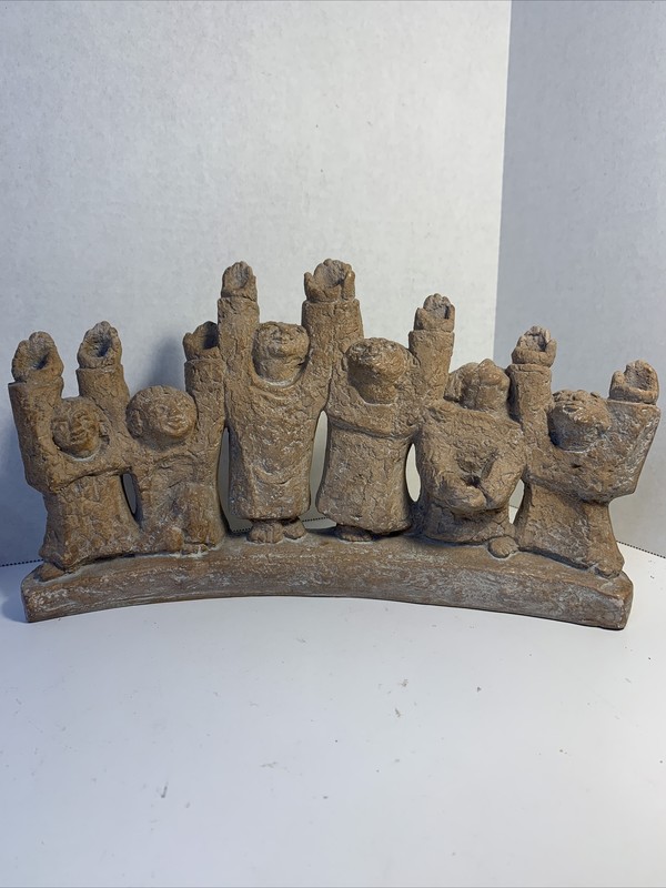 A collection of weathered, ancient-looking clay figurines is arranged on a white background. The figurines are of various sizes and appear to be in a state of disrepair, with visible cracks and wear. They are positioned in a way that suggests they are part of a larger scene or display, with some figurines standing upright and others lying down. | VTG 1965 MENORAH Hanukkah SCULPTURE austin productions 9 candle ELLEN LORD clay | 08b0b12b8cfa0a301918c63afc90f8b1f627b17baa314e420ae1257ebd101071 | 001065764755 | 0 | 0 | 59 | 12 | 0 | 0 | |