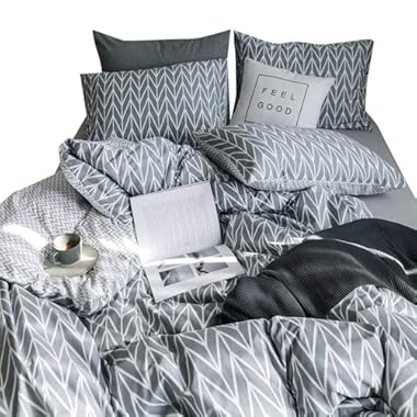 A neatly made bed with a grey and white geometric patterned duvet and two matching pillows. One pillow has a white square with the word 'FEEL GOOD' in black text. A grey throw blanket is draped over the side of the bed. On the bed, there is a white book with a black cover, a silver laptop, a white mug, and a small white cup. | AMWAN Cotton Reversible Geometric Duvet Cover Set Queen Modern Soft Chevron Striped Bedding Set Full 3 Piece Luxury Hotel Duvet Comforter Cover Set Full Queen 1 Duvet Cover with 2 Pillowcases | a99b0ff8604dd38af36b6b6acc069e52d33eac594c1141b9e290a330c0597c80 | 001065764788 | 0 | 0 | 65 | 31 | 0 | 0 | |