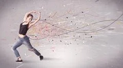 A young woman is dancing in a studio with a colorful, abstract background that includes swirling patterns and shapes. She is wearing a black tank top, blue jeans with a ripped knee, and black sneakers. Her hair is styled in a bun, and she is wearing a black headband. The woman is in a dynamic dance pose with one leg lifted behind her and her arms extended to the sides. | Urban dancing with lines and splatter Stock Photos | 400c70b9dccb12eff7087d775edb24c23b1bf4fc1548461c9aa1d994d64785a7 | 001065764855 | 0 | 0 | 70 | 8 | 0 | 0 | |