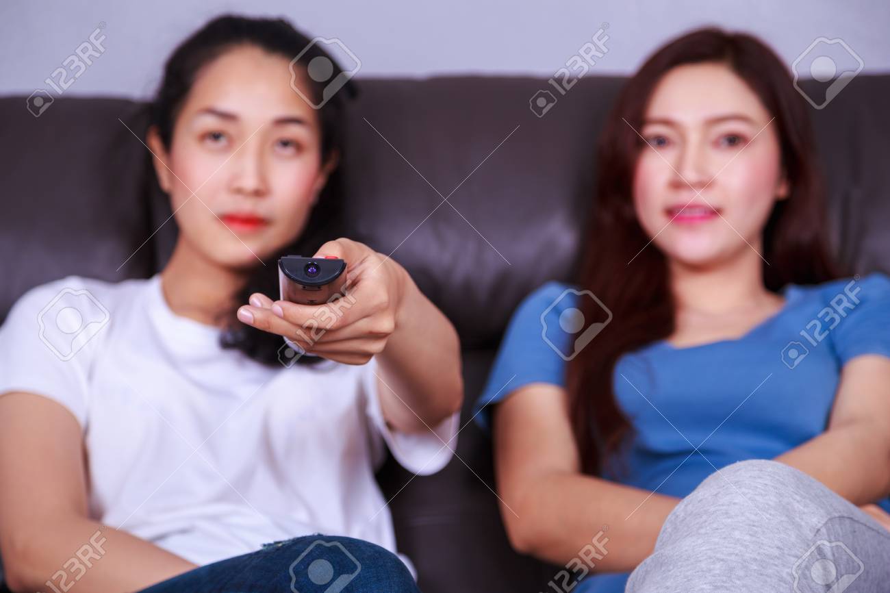 Two women are sitting on a couch, one holding a remote control. The woman on the left is wearing a white shirt and has long black hair. The woman on the right is wearing a blue shirt and has long brown hair. They are both smiling and looking at the camera. | two best friends watching tv with remote on sofa in living room.. | 4be0e97a1d8929ec6099caf26c38c7cc88a5439be3f660a34bcd495b6f832677 | 001065764833 | 0 | 0 | 51 | 12 | 0 | 0 | |