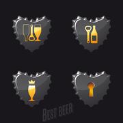 The second image shows a set of four badges with a different design. The top left badge features a wine glass with a golden rim and a golden handle, the top right badge has a bottle with a golden label and a golden cap, the bottom left badge displays a beer glass with a golden rim and a golden handle, and the bottom right badge shows a beer bottle with a golden label and a golden cap. The badges are arranged in a similar manner to the first image, with the text 'BEST BEER' at the bottom. The background is a solid black color. | Beer and pub icons Stock Illustration | f395146e4350a24831e00b06bad0208e0606503d9fbb513a858392600daf99a2 | 001065767067 | 0 | 0 | 104 | 6 | 0 | 0 | |