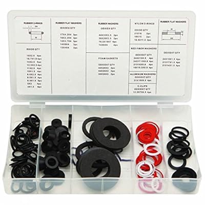 A white plastic toolbox is open, revealing an organized array of various rubber bands in different colors and sizes. The toolbox has a white label with black text, detailing the contents and their corresponding colors. The rubber bands are neatly arranged in compartments, with some placed in rows and others in stacks. The colors include black, red, white, and pink. | 125 Pc Rubber O-ring Hose Gasket Flat Washer Faucet Gromet Assortment Set Kit | a1a3610ddb48ae53d1b452db0e036a92b2ffb6914f69bb10e43e61c25df2b5c0 | 001065767115 | 0 | 0 | 60 | 13 | 0 | 0 | |