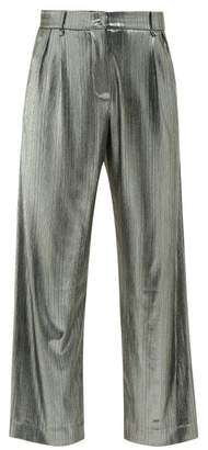 A pair of grey pinstripe shorts with a shiny texture. | BLAZ\xc3\x89 MILANO Nova Metallic Jersey Trousers - Womens - Silver | 561c6847712fec8ffcea93ef212f18da8de3f021e2c8e110806e088be6f5fb11 | 001065767131 | 0 | 0 | 10 | 10 | 0 | 0 | |