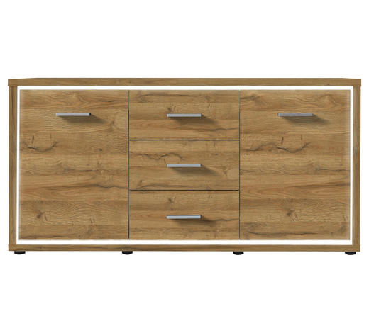 A wooden dresser with a modern design, featuring a light wood finish and a sleek metal handle on each drawer. The dresser has a clean, minimalist look with a focus on the natural grain of the wood. | SIDEBOARD Melamin Eichefarben - Eichefarben, KONVENTIONELL (145/80/38cm) - Carryhome | 953886c91af50655e4dd5d86f754b77ae3eb591d944e4bd54551dddb3ae93ea7 | 001065767524 | 0 | 0 | 37 | 9 | 0 | 0 | |