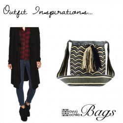 A woman is standing in front of a black background, wearing a black coat over a red and black plaid shirt, paired with blue jeans and black boots. She is holding a black and white striped bag with a tassel. The image has a stylized text overlay that reads 'OUTFIT INSPIRATIONS...' and 'BAGS' at the bottom. | Way\xc3\xbau Out fit Inspirations winter 1 | c03943fdd3c1d1ebbf2731e4758e2c64915710e254c55129a0e2153ed8195f11 | 001065767526 | 0 | 0 | 56 | 6 | 0 | 0 | |