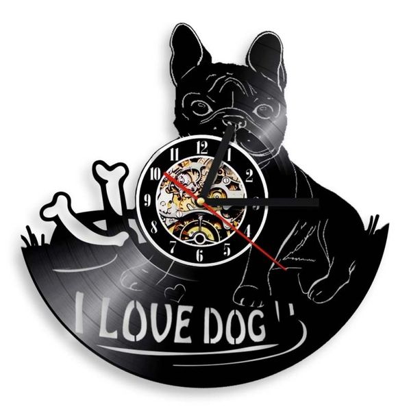 A vinyl record with a black and white illustration of a bulldog wearing a watch on its neck, with the words 'I LOVE DOG' written in white cursive script at the bottom. The record has a white border and is set against a white background. | Franse Bulldog Vinyl Record Art Vinyl Wall Clock Gift Home Decor Handmade Art Personality Gift (Size: 12 inches, Color: Black) | fea570f8c535dc95b270018b24fbb4c36eb407a73be4efdd4017016f0867c22b | 001065767564 | 0 | 0 | 45 | 20 | 0 | 0 | |